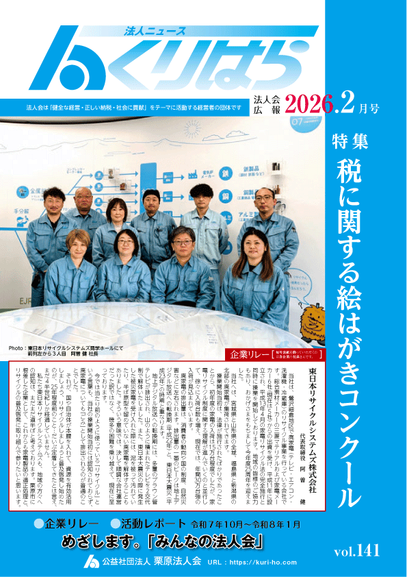 最新ニュース 2022年7月1日 コメントはまだありません New_市民公開講座「出汁パック作り」ご案内New_実務セミナー「キャッシュレス納付のはじめの一歩を体験しよう!」ご案内・申込2026新春講演会並びに賀詞交歓会ご案内・申込書ご希望の小冊子を無料で贈呈のご案内・申込書第18回税に関する絵はがきコンクールinくりはら開催のご案内市民公開講座「ひょうたんランプ作り」ご案内税を考える週間(11月11日~17日)特別企画 「税務・会計等セミナーご案内」栗原市に対する行財政改革についてのアンケート実施※栗原市長・栗原市議会議長へ行財政改革の陳情に栗原法人会を代表して行く際に会員の声を届けて参ります!ぜひ、アンケートにご協力をお願いします!栗原地域懇談会ご案内・申込書第12回市民健康パークゴルフ大会ご案内 申込書若手経営者のためのビジネスセミナーご案内くりはらレクリエーション大会ご案内エンジョイゴルフご案内 申込書市民公開講座②陶芸教室ご案内 申込書新入会員紹介キャンペーン実施中! 法人会加入のメリットとは!?第9回高校生の税の写真展作品募集中! 申込書令和7年度移動健診車による特割定期健康診断のご案内 特割健診申込書 ※エクセル様式が必要な方は事務局迄 ◎お得な制度(付加健診)のご案内・◎特殊健康診断項目リスト・◎受診される団体のご担当者さまへ ◎ご家族の方も一緒に健診を受けてみませんか?市民公開講座①アート書道教室ご案内 申込書
